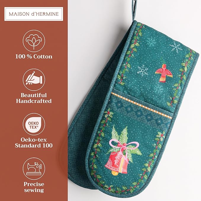 Maison d' Hermine Double Oven Mitt (7" x 35") 100% Cotton Heat Resistant BBQ Cooking Gloves with Loop for Thanksgiving Christmas Decorations Baking Cooking Barbeque Handling Hot Pan (Hygge Christmas)