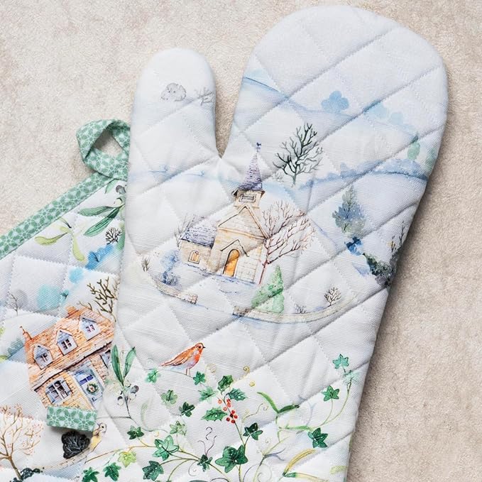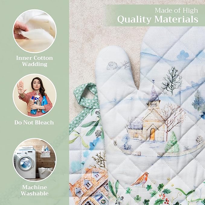 Maison d' Hermine 100% Cotton Oven Mitt & Pot Holder Set (7.5"x13" & 8"x8") Heat Resistant BBQ Cooking Gloves with Loop for Thanksgiving Christmas Decorations Handling Hot Pans (Snowy World)
