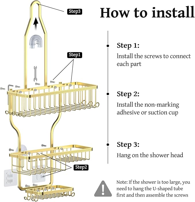 - Non-Slip Bathroom Organizer - Thanks to the anti-slip rubber circle on the top of the shower hanger and wall fixing accessories (1 suction cups and 2 adhesive), the shower hanger remains stable even when the shower organizer over shower head is filled with bottles. The two wall fixing methods can apply to a variety of walls, and you can choose one of them according to your needs