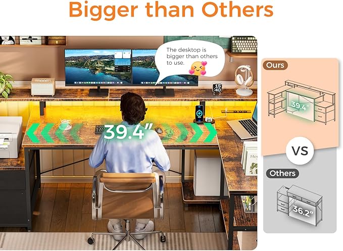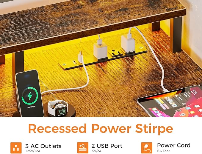 - 【Convenient Charging & Monitor Stand】:The l shaped desk with power outlet features 3 standard plug outlets and 2 USB ports, providing convenient charging for your laptop, phone and gaming devices. The long monitor stand protects your neck and spine health and also creates extra storage space for your items.