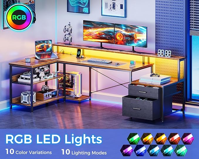 - 【Cool LED Lighting 】: The l shaped gaming desk offers a wide range of options for LED lights, including 7 colors, 13 modes, 8 adjustable brightness levels, and 9 flicker frequencies. With its memory function, it will remember the last mode used when turned on. Choose your preferred color and mode to start the game.