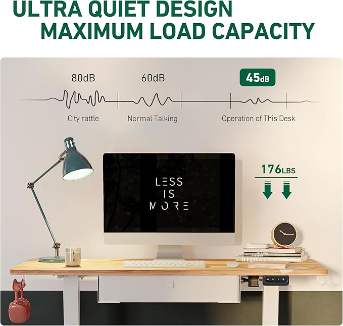 - Height Adjustable Lift: The brake system is controlled by electric motors to adjust different tabletop heights from 27.7 to 46.6 Inches. 4 Positions memory functions lift conveniently and quickly.This standing desk operates with 45 db.