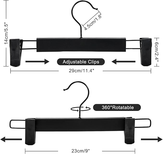 - 【Excellent design】: Our trousers hangers are very versatile, the stainless steel hooks can be rotated 360 degrees and can be hung in various positions, the hanger has removable clips at both ends, which can be adjusted from 21 cm to 28 cm, not only suitable for adult clothes, but also For children's clothing, in addition, the clips has a non-slip design, which can firmly hold your clothing and prevent it from falling