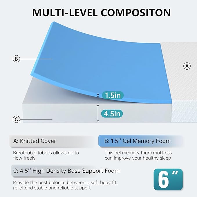 PayLessHere Queen Size Mattress,6 Inch Gel Memory Foam Mattress in a Box,Medium-Firm,Pressure Relief&Temperature Regulation,CertiPUR-US Certified,White