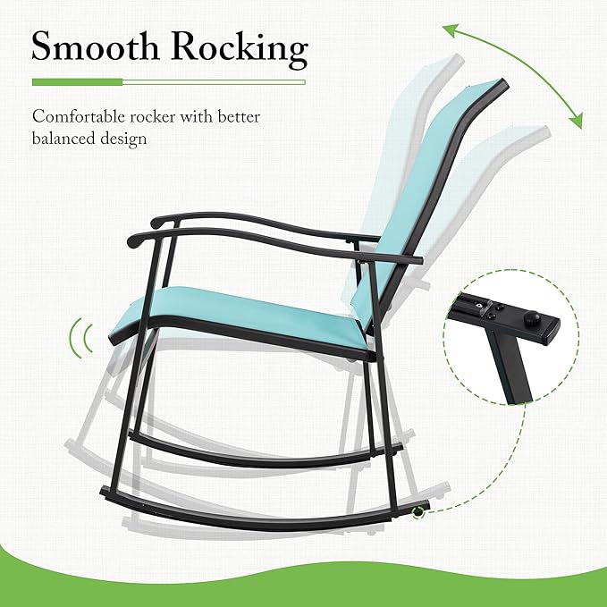 - Wide application: This small patio furniture set includes one bistro coffee table and 2 rocking chairs. The simple looking and solid color making it suitable for yard, poolside, lawn, balcony, garden and front porch.