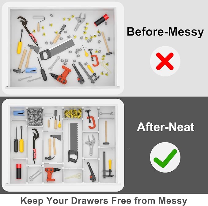 - LASTING STABILITY: To ensure the long-lasting and stable work of the dividers in the drawer, both ends of long divider come with 0.4 inches thick foam pad, which effectively increases the grip of the divider and prevents scratches on the drawer. Another ingenious point is that we use a serrated design instead of a spring design, which solves the problem that divider organizer is easy to loose after long-term use