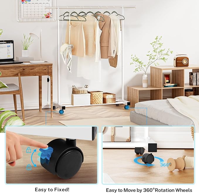 - 【Intimate design】- The top rod is made of stainless steel, which is not easy to be scratched by the coat hanger; There is a convex design on both top sides to prevent the clothes hanger from sliding; The rolling clothes rack is equipped with 360° wheel, which is convenient for carrying the metal clothing rack to slide to the place you want to go.