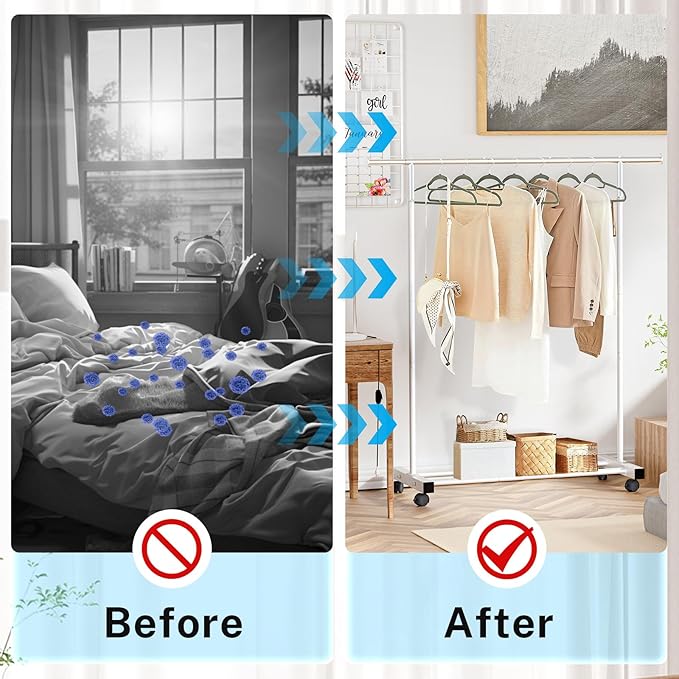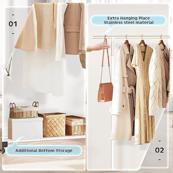 - 【Extra Storage】- The bottom of the wardrobe rack provides additional storage space for shoes, storage boxes, etc. The extension rods on both sides of the top rod also provide additional hanging space, which can be used to hang some scarves, bags, hats, etc.