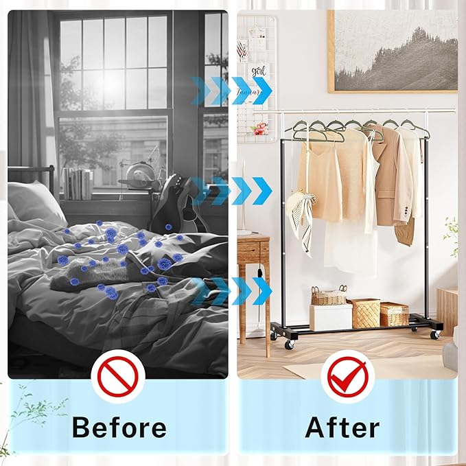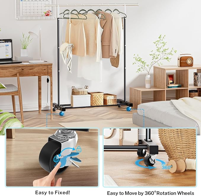 - 【Intimate design】- The top rod is made of stainless steel, which is not easy to be scratched by the coat hanger; There is a convex design on both top sides to prevent the clothes hanger from sliding; The rolling clothes rack is equipped with 360° wheel, which is convenient for carrying the metal clothing rack to slide to the place you want to go.