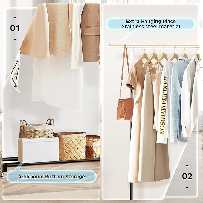 - 【Extra Storage】- The bottom of the wardrobe rack provides additional storage space for shoes, storage boxes, etc. The extension rods on both sides of the top rod also provide additional hanging space, which can be used to hang some scarves, bags, hats, etc.