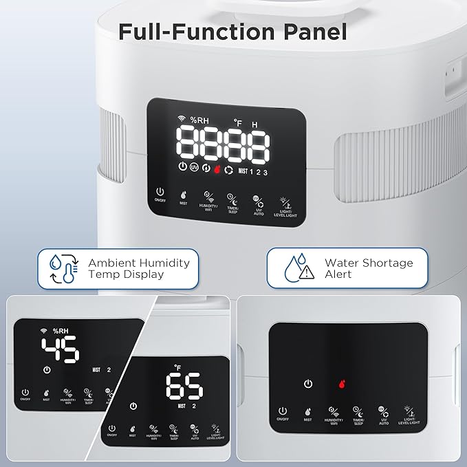 - 【Easy To Use】The display shows the ambient humidity and temperature to help you keep track of the surrounding environment. With its low-noise fan and sleep mode (all LED lights turn off), the GLH20 humidifier won't disturb your sleep at night.