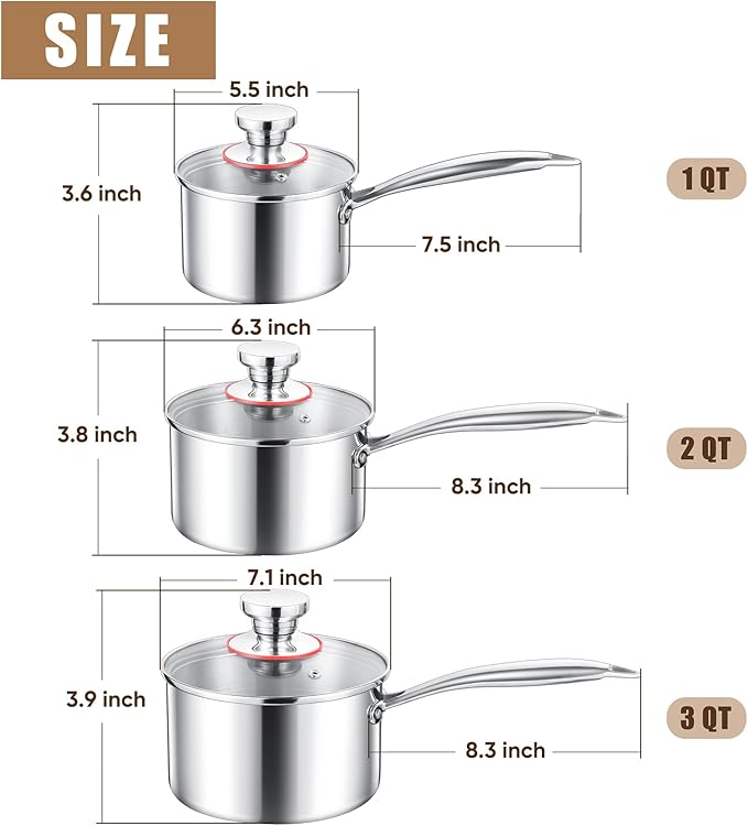 - SET OF 3 - This set includes 3 saucepans with 1QT, 2QT and 3QT capacities, Can be used to boil water, cook and reduce sauces, make rice and oatmeal, warm milk, reheat leftovers, Great for stewing, simmering, making soups, poaching eggs and “whisk jobs”, Ideal gift for Christmas, Thanksgiving Day, housewarming and other special occasions