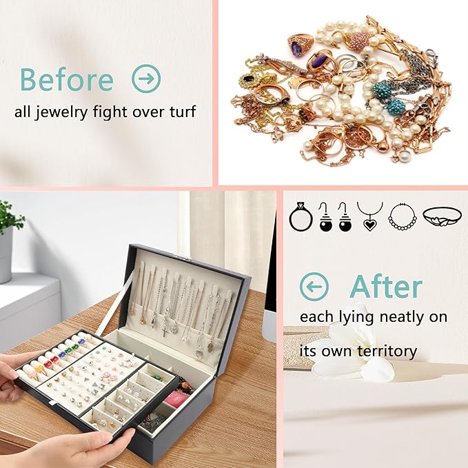 - Large Capacity: 23×17×8.5 cm. Design with the 2-layer structure for organizing all types of jewellery, including necklaces, earrings, bracelets, rings, hair accessories, watches, etc. The spacious space keeps your jewellery in order and can be easily found at any time.