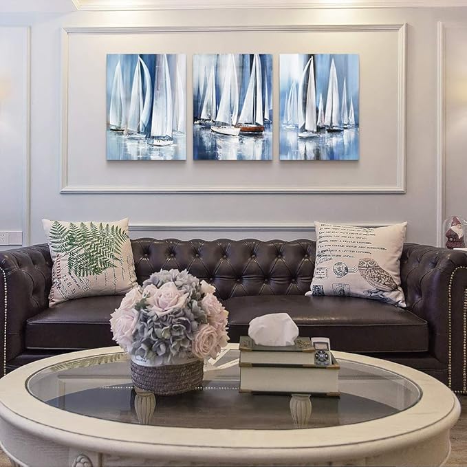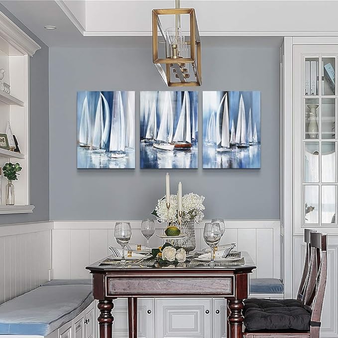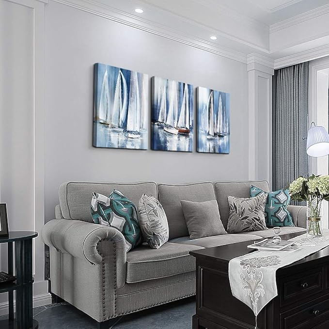 3 Piece Framed Canvas Wall Art For Living Room Bathroom Bedroom Wall Art Decor Ocean Landscape Sailboat Abstract Canvas Painting Ready To Hang Office Home Decoration Sea Poster Pictures Wall Artworks