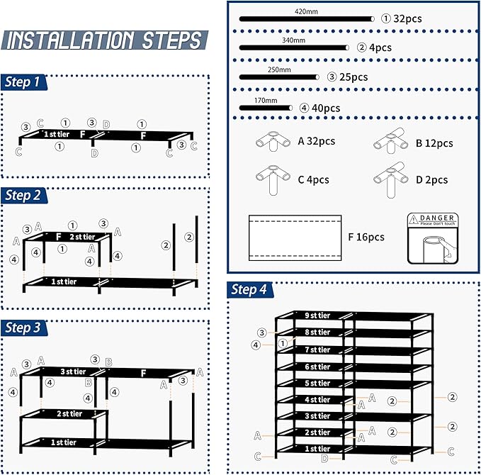 - STURDY & DURABLE: This 9-tier shoes rack is made of metal pipes with black powder coating, high-quality PP connectors and waterproof non-woven compartments. It is very strong and durable, waterproof and dustproof. Use it to make your shoes neater and make your space more spacious.