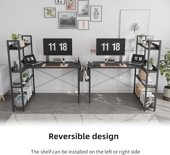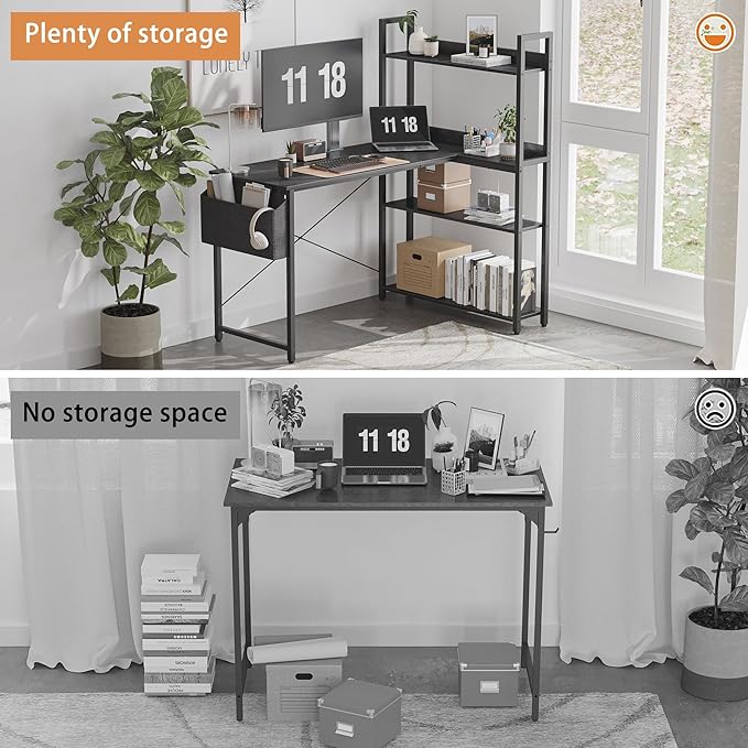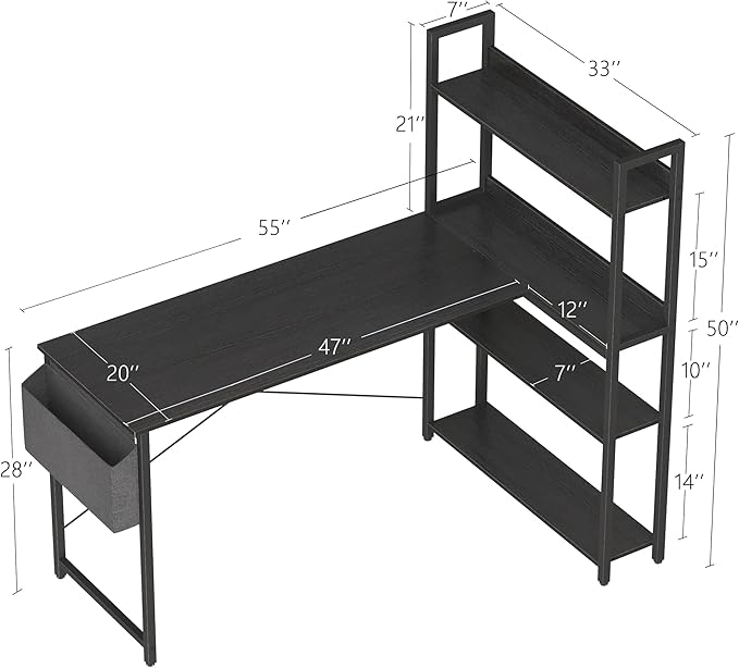 - Ample Storage Options: The desk is equipped with a 4-tier shelf and a side storage bag, offering multiple storage options to keep your essentials organized and within reach. The shelves can accommodate books, documents, office supplies, or decorative items, while the side storage bag is perfect for holding magazines, notebooks, or small electronics.