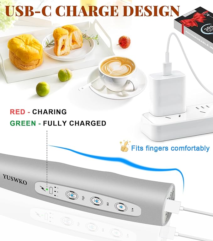 - 🎀【USB-C Rechargeable Milk Frother】This electric milk frother is powered by a built-in 1200mAh rechargeable battery, no need to replace any batteries, environmentally friendly and durable. Compared with the traditional Micro USB charging port, the USB-C charging port design makes it more compatible and faster charging. The charging indicator light is red when charging, and green when fully charged.