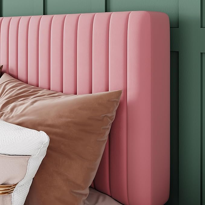 Allewie King Bed Frame, Velvet Upholstered Platform Bed with Adjustable Vertical Channel Tufted Headboard, Mattress Foundation with Strong Wooden Slats, Box Spring Optional, Easy Assembly, Pink