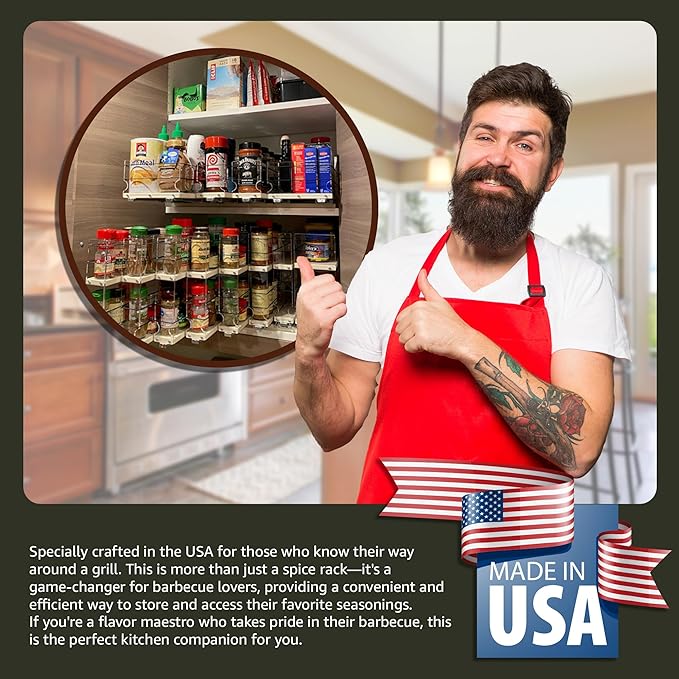 - USA MADE WITH PREMIUM MATERIALS: Proudly crafted in the USA, this Vertical Spice sliding spice rack organizer features HDPE base and drawers, clear acrylic ends for visibility, and ball bearing slides for smooth action. Its Flex-Sides ensure containers are securely retained with easy access.
