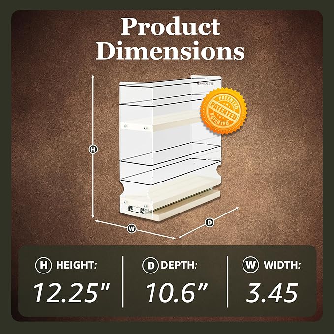- OPTIMAL SIZE FOR EFFICIENT STORAGE: Featuring 2 tiers measuring 3.45" x 12.25" x 10.6", this sliding spice rack organizer offers ample space to store your spices and kitchen essentials. Its compact yet functional design ensures efficient use of space without compromising on storage capacity.