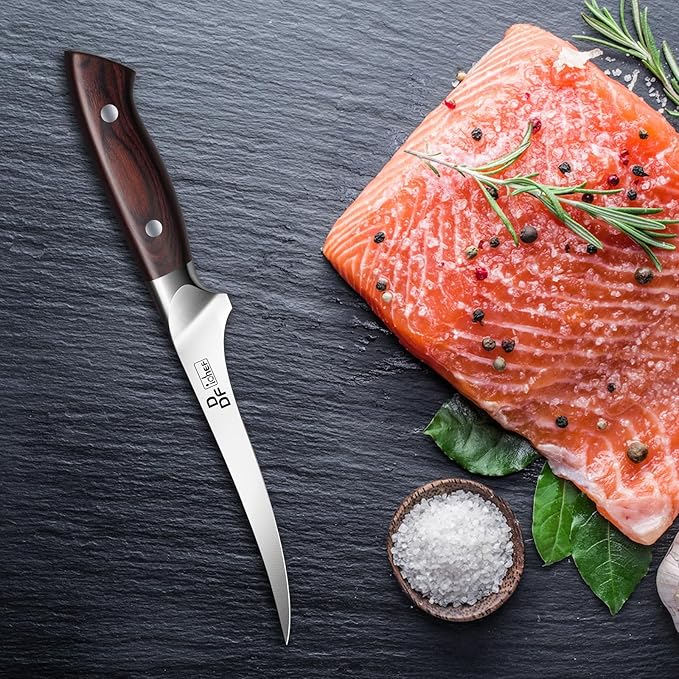 - 【WELL BALANCE】: Sloped bolster design between blade and handle is well balanced, strengthen the stability, reducing strain on your wrist, the knife allows you to fillet fish like a breeze.