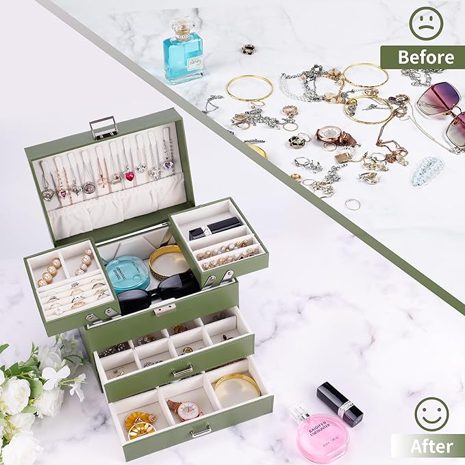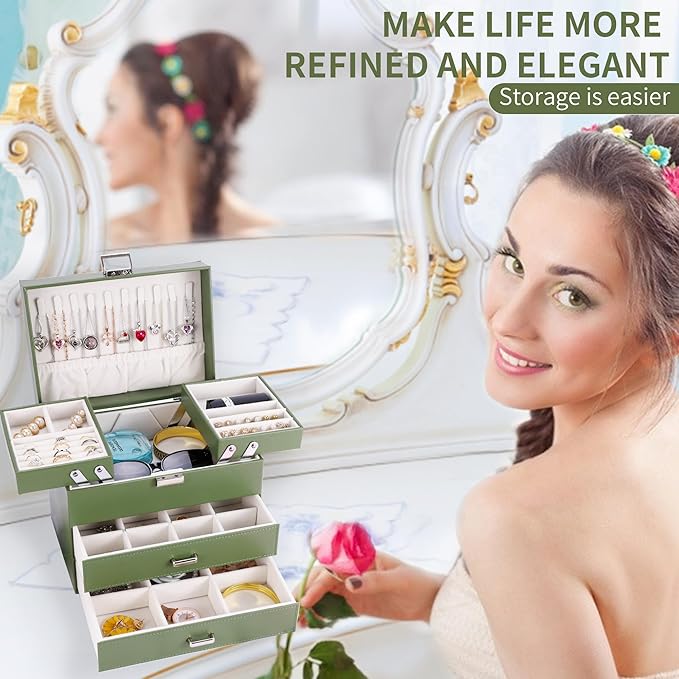 Dajasan Jewelry Organizer Box for Women Girls, Jewelry Holder Organizer, 4 Layers Leather Jewelry Box, Gift Idea for Valentine's Day, Christmas, New Year, Birthdays (Green)