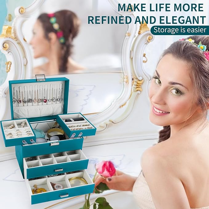 Dajasan Jewelry Box Organizer, Jewelry Holder Organizer Box, 4 Layers Leather Jewelry Storage Box, Gift Idea for Women, Girlfriends, Wife or Mother (Blue)