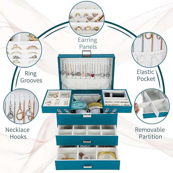 - Multifunctional Jewelry Box: The large jewelry storage box has 5 ring slots, 9 ring boxes, 10 necklace hooks, 26 ear stud holes, 2 adjustable space compartments, 2 Drawers. The jewelry organizer box has a variety of designs and compartments, which can store all your jewelry, whether it is a large piece of jewelry or a small earring, there is a place to store it