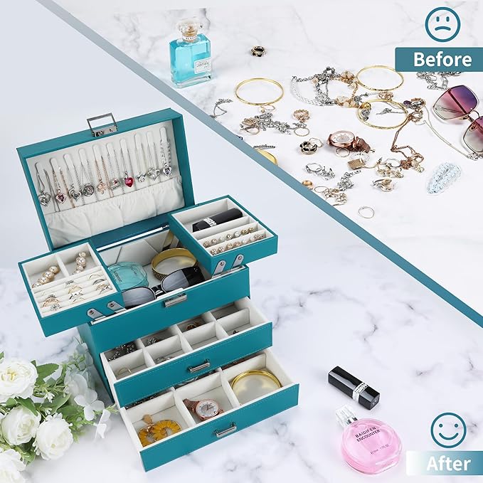 - Space-Saving Jewelry Organizer: With our leather jewelry box, all your jewelry will be organized and easy to access. From then on, you have a bright dressing table that makes your room look more tidy and elegance. Moreover, the classification design of our large jewelry box organizer allows you to reduce the search time