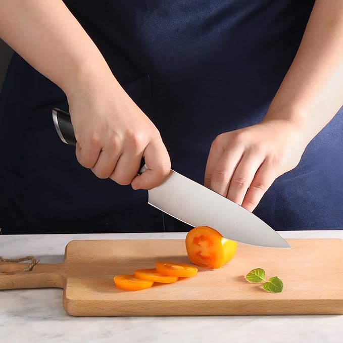 - Handcrafted full-tang knives forged from tight-grained X50CrMoV15 German Steel for incredible durability, stain resistance, and exceptional edge retention.