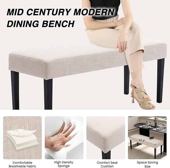 Farmhouse Upholstered Dining Bench Seat Set of 2, 45" Linen Fabric Entryway Bench with Black Wood Legs, Mid Century Modern End of Bed Bench for Kitchen Bedroom Living Room Hallway, Beige