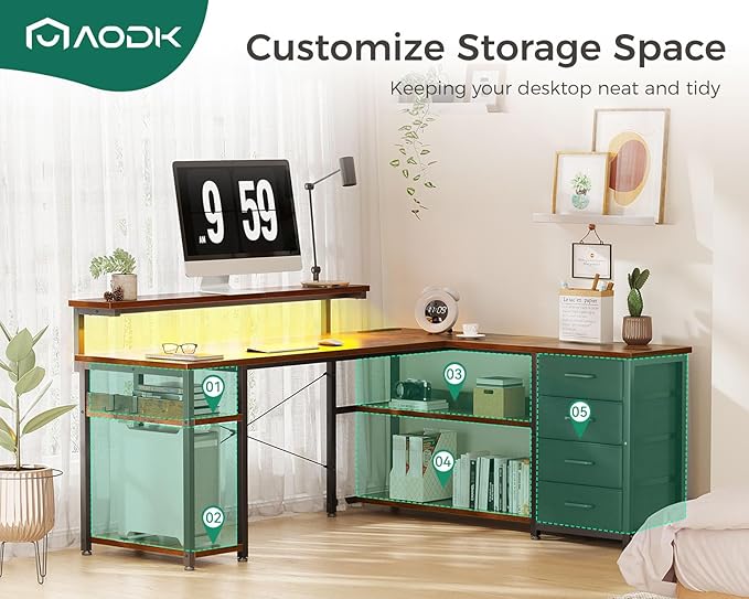 - 【Super Large Storage Space】 The AODK L-shaped desk provides 1 monitor stand, 1 CPU stand, 1 iron hook, 2 open shelfs and 4 Tier of drawers, which gives you super plenty of under-desk storage space to help you store your books, work files and small office stuffs, make your work and study more efficient. The height adjustable ergonomic monitor stand engineered to reduce back and neck stress by promoting a better sitting posture.
