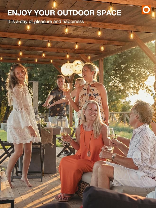 - IP 65 Waterproof & Shatterproof:Our outdoor patio lights waterproof can withstand rain, sun, wind, snow and extreme temperatures. Made of hard anti-drop plastic, the shatterproof bulbs protect our outside lights from breaking and falling. With excellent waterproof and durable plastic bulbs, we believe the edison string lights for outside is great decorations for bistro, patios, backyards, decks and more.
