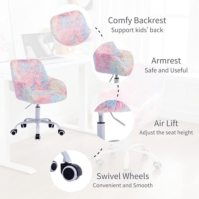 HEAH-YO Swivel Kids Chair with Wheels, Adjustable Kids Desk Chair with Armrest and Back, Cute Faux Fur Kid Study Chairs for Boys and Girls, Light Multi-Colour