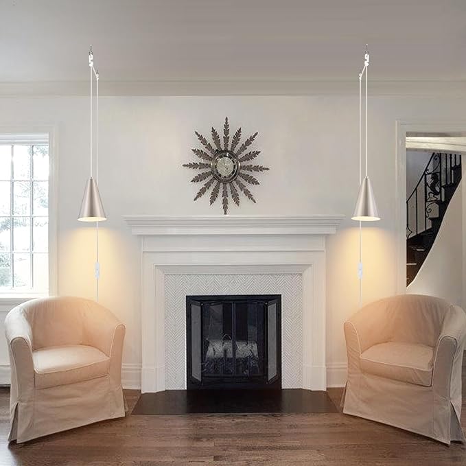 - Modern Farmhouse Style: This brushed nickel finish plug in smallpendant light combines modern and farmhouse,stylish cone lampshade shape, breaks the visual balance of the space and creates a high-level decorative interest