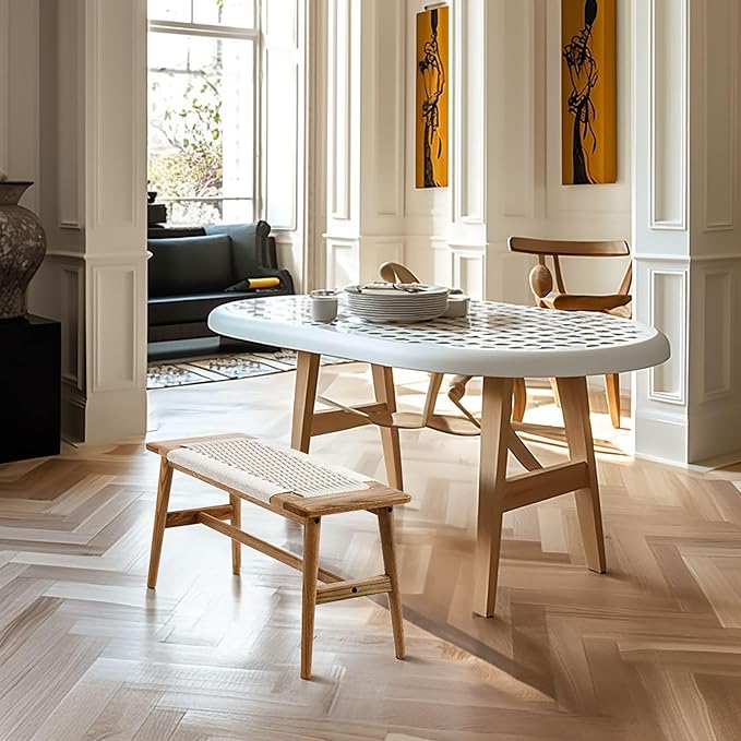 31.5'' Woven Dining Beach with 100% Solid Oak Wood Bench Frame, Hand Knitted Rope Designed Bed End Shoe Bench for Kitchen Bedroom Entryway, White