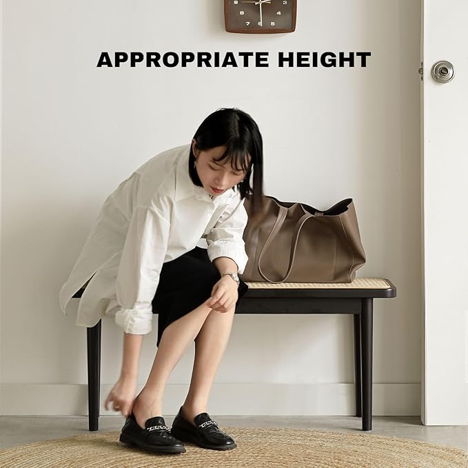39.4'' Natural Rattan Dining Bench with 100% Solid Oak Wood Bench Frame, Bed End Shoe Ottoman for Kitchen Bedroom Entryway, Black