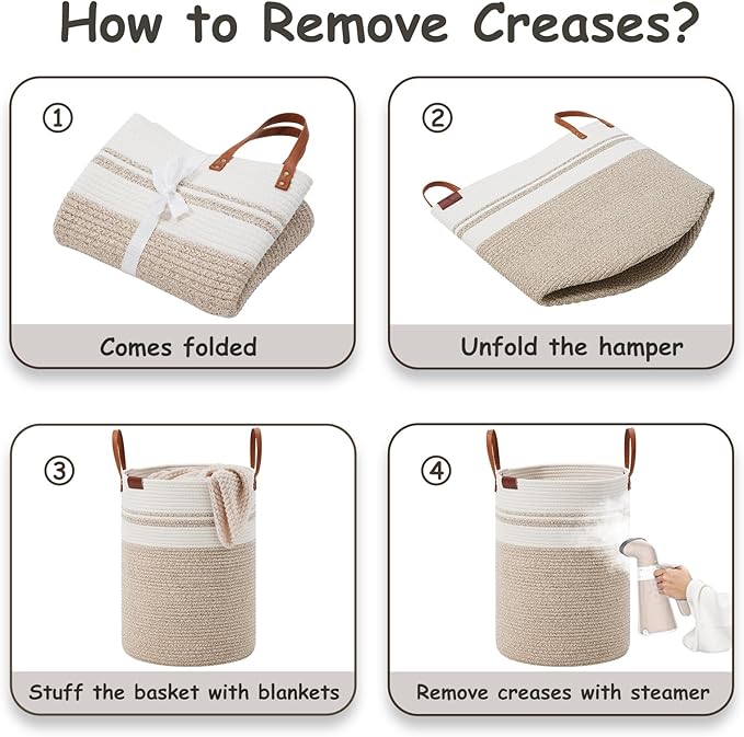 - ❤【WAY TO RESTORE ELEGANT SHAPE】 Our collapsible baskets are folded during shipping. Please fill the hamper with clothes or blankets for a period of time. If you want to remove creases from the surface of the tall basket, you can use a steamer.