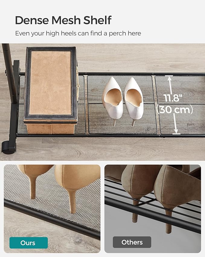 - Con estante de almacenamiento: El estante de malla inferior tiene capacidad para 10 kg, por lo que es perfecto para sus zapatos y cajas de almacenamiento. La malla está estrechamente espaciados, por lo que incluso tus tacones pueden encontrar un lugar