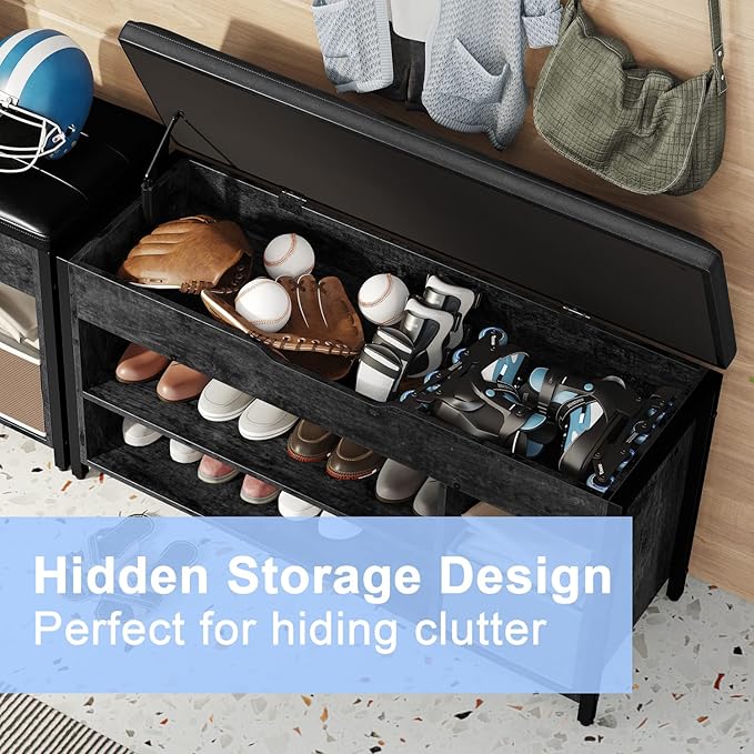 - 【Lift Top Hidden Storage】Shoe storage bench with a lift top storage design provides space for storing small items and protects your entryways from disorder The safe and strong hinges can keeping this storage up so that you don`t have to hold it with your hand ; gently open the cushion can be fixed, sturdy support points to avoid pinching hand.