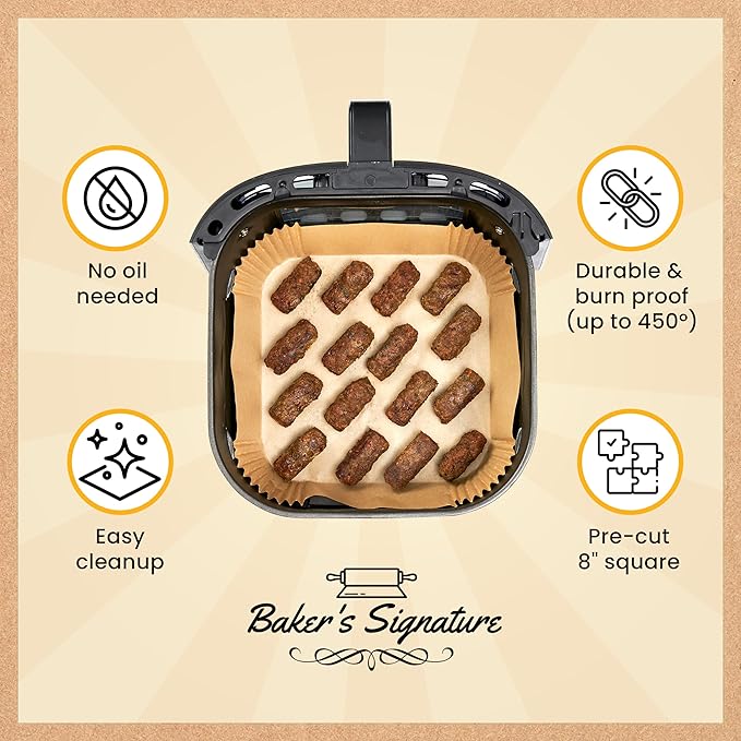 Air Fryer Paper Liners, 125Pcs Air Fryer Disposable Liners, Non-Stick and Oil Proof for Easy Cleanup, 8” Square for 5-8 qt Basket by Baker's Signature