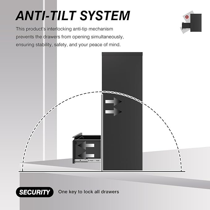 - 【Anti-tilt Design】This metal file cabinet has been designed with precision interlock devices and an external ANTI-TILT mechanism. As a result, when one drawer is opened, the interlocking system prevents any other drawer from being opened, ensuring that the cabinet stays upright and keeps you safe. This makes it a safer option compared to other file cabinets.