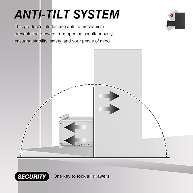 - 【Anti-tilt Design】This metal file cabinet has been designed with precision interlock devices and an external ANTI-TILT mechanism. As a result, when one drawer is opened, the interlocking system prevents any other drawer from being opened, ensuring that the cabinet stays upright and keeps you safe. This makes it a safer option compared to other file cabinets.