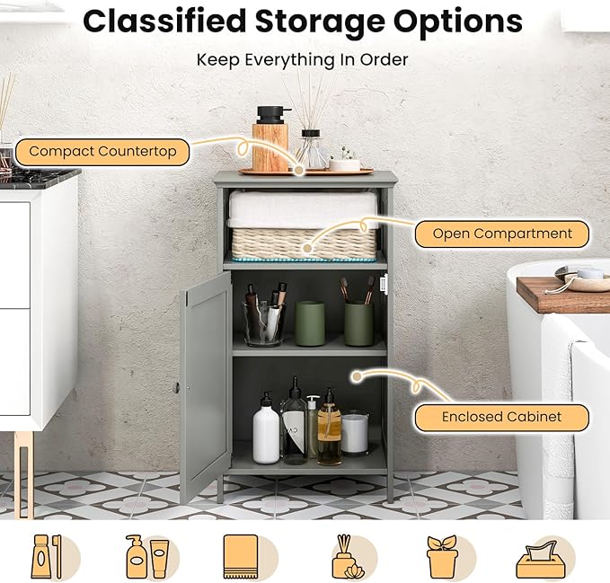 Tangkula Bathroom Storage Cabinet, Freestanding Wooden Single Door Side Floor Organizer with Adjustable Shelf, Small Bathroom Cabinet for Small Spaces, Living Room (Grey)