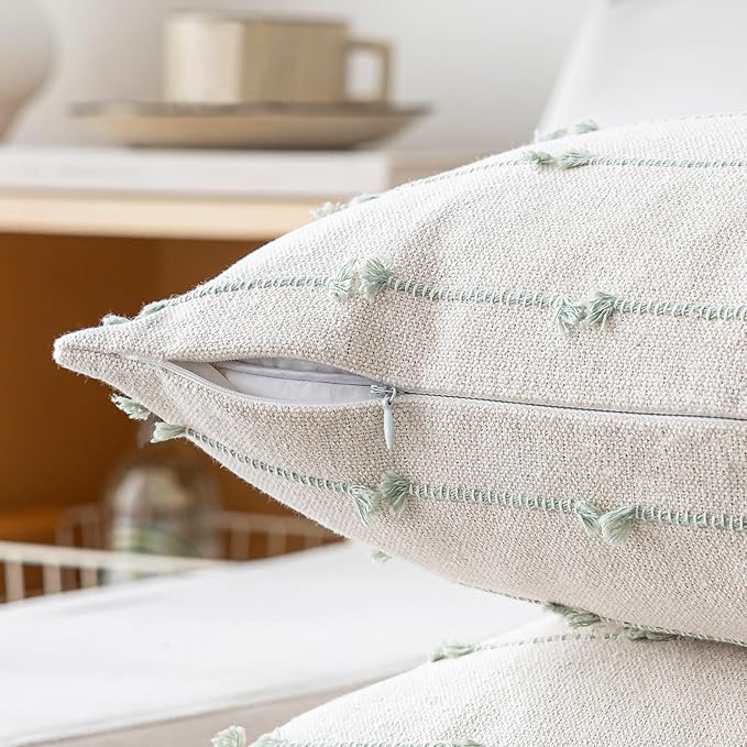 Boho Throw Pillow Covers 18x18 Set of 2 Modern Farmhouse Decorative Cushion Case Tufed Square Pillows Cover Neutral Pillow Cases Accent Pillowcase for Sofa,Couch,Bed,Beige and Green