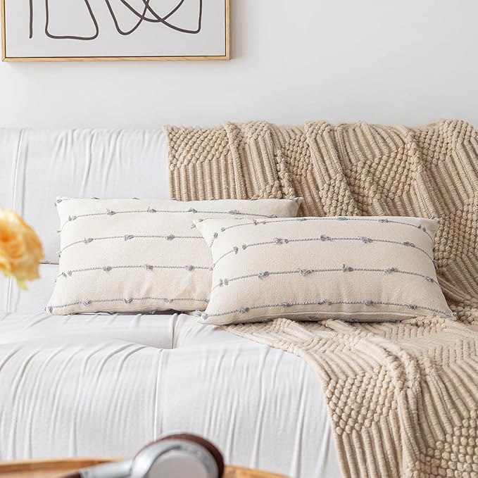 Boho Throw Pillow Covers 12x20 Set of 2 Modern Farmhouse Decorative Cushion Case Tufted Linen Square Pillows Cover Neutral Pillow Cases Accent Pillowcase for Sofa,Couch,Bed,Beige and Grey