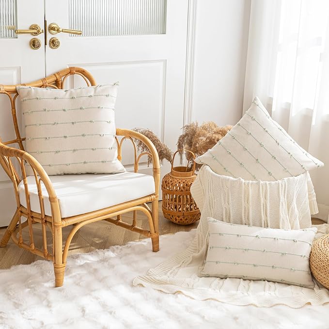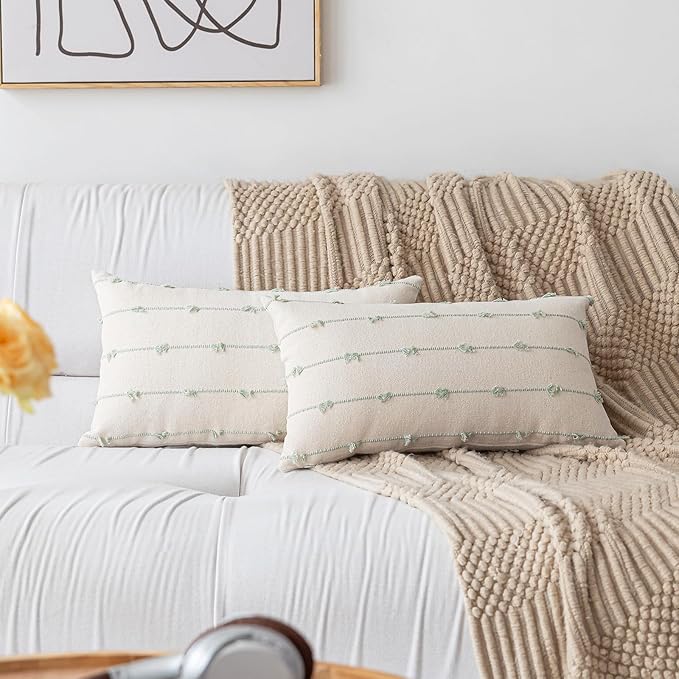 Boho Throw Pillow Covers12x20 Set of 2 Modern Farmhouse Decorative Cushion Case Tufted Linen Square Pillow Cover Neutral Pillow Cases Accent Pillowcase for Sofa,Couch,Bed,Beige and Green