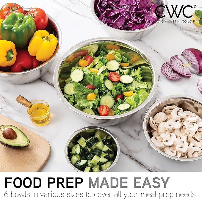 - 6 Piece Stainless Steel Nesting Bowls Set includes 6 Prep Bowl and Mixing Bowls - a practical set of easy to clean kitchen bowls that can be used for food prep, serving and storing.