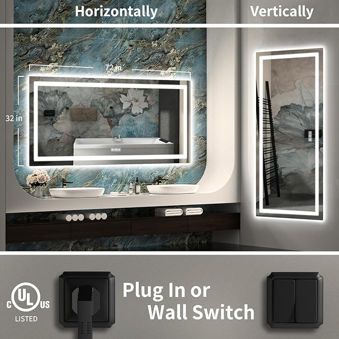 - 【Anti-fog & Automatic Power-off Protection】With upgraded anti-fog film, the fog-proof surface occupies 60% of the mirror, larger than other led mirrors. The mirror’s defogger and light switches can be controlled separately. Users can turn on the defogger switch for only 5-10 minutes to ensure a clear reflection. The power will automatically turn off after over one hour of continuous work to prevent overheating.