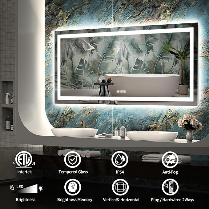 - 【 ETL Quality & Backlit+Front Light】This LED Mirror for the Bathroom is ETL certified, meeting safety standards. The power supply and LED lights are UL listed and have a lifespan of more than 50,000 hours. It features built-in two IP54 waterproof LED light strips that provide both backlit and front light. The mirror is made of 5mm thinner shatter-proof tempered glass, offering high and robust quality with a lighter overall weight compared to ordinary LED mirrors.
